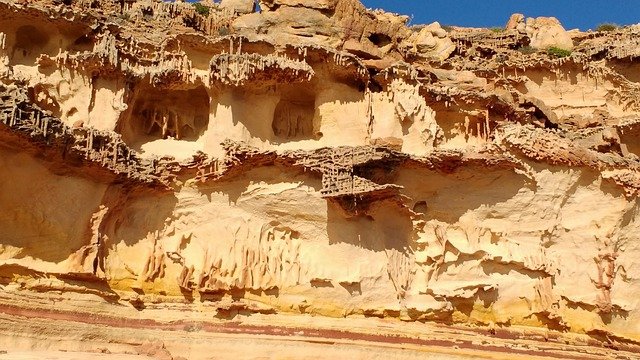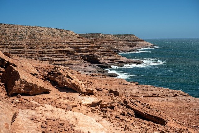 Admirez le panorama depuis Nature’s Window, une arche naturelle qui encadre la rivière Murchison, et explorez les Kalbarri Cliffs, falaises rouges plongeant dans l’océan.